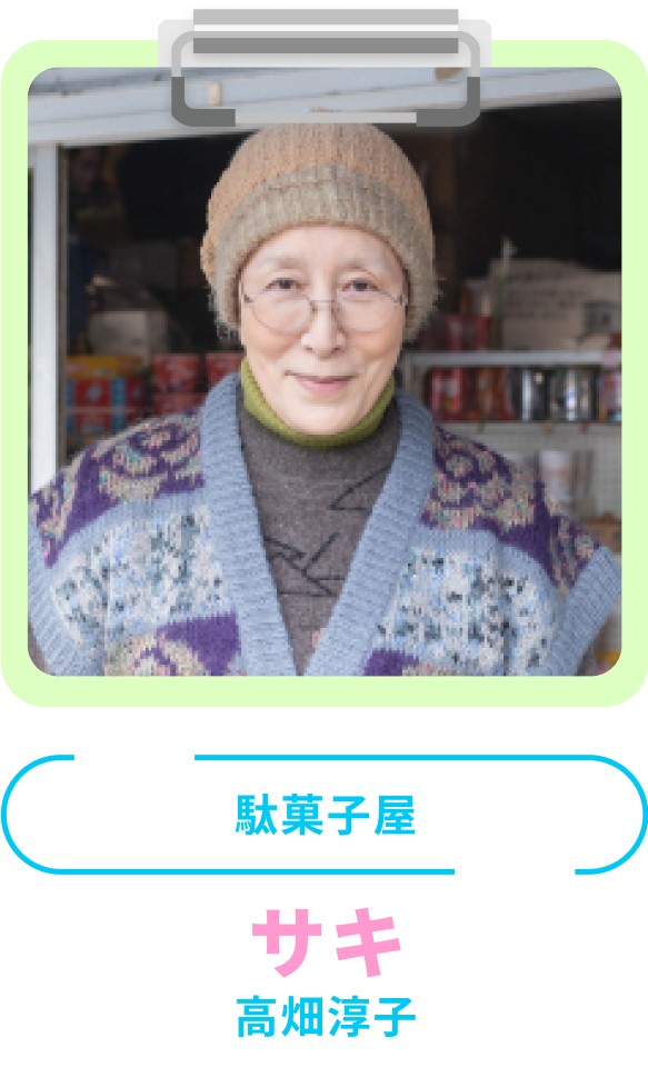 前作を拝見して、もう~面白くて、光栄でした。尊敬する木野花さんがなさっていた事もあり……又、又、光栄です。(駄菓子屋店主・サキを演じるにあたって)いや~、ダラ~と、ぬる~と、居る様にしなきゃなーと!!(市原さんと共演して)とにかく、完ぺきな方なので緊張しました。面白いです!!そして何故か元気になるんです!どーしてだろう!!