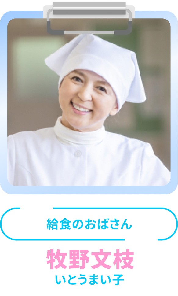 世話好きな給食のおばさん、牧野文枝でございます。人生いろいろありまして、実家の函館に戻りましたところ、なんと!まさか!ウソでしょう!?甘利田先生と同じ中学校で再会してしまい、おいしい給食を食べて頂ける事になりました。奇跡のような偶然、毎日学校へ行くのが本当に楽しいです。シーズン3は更にパワーアップして戻ってきましたので、是非お楽しみ下さいね~♪
